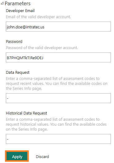 3. Under Parameters, fill the credentials with a valid Developer account email and password.