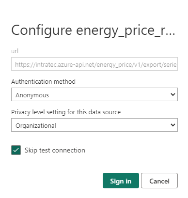 A pop-up will open to configure access to the Intratec APIs. Set it up as displayed below and click Sign in.