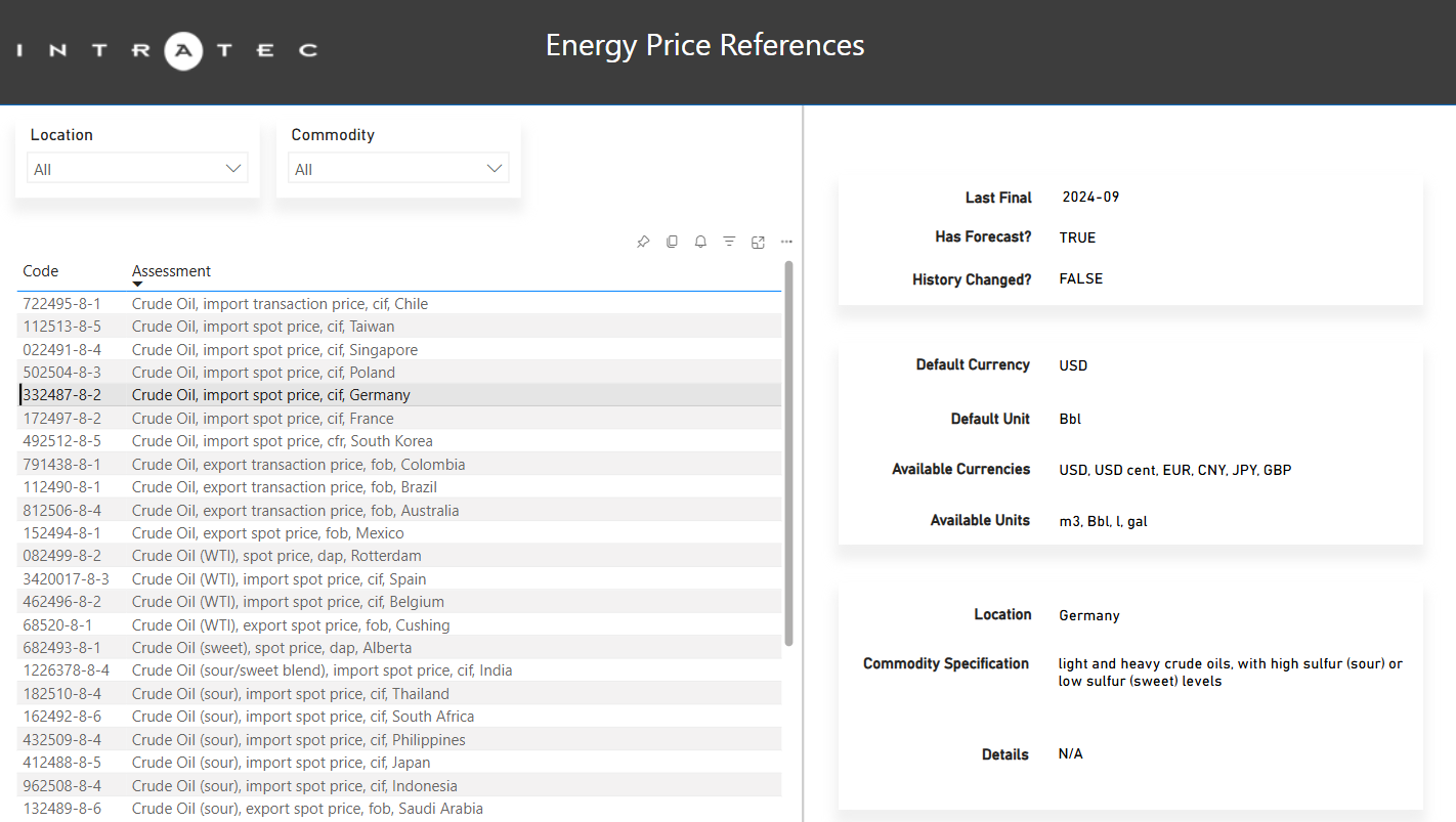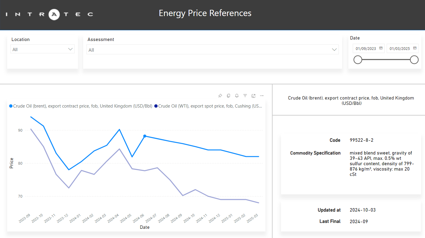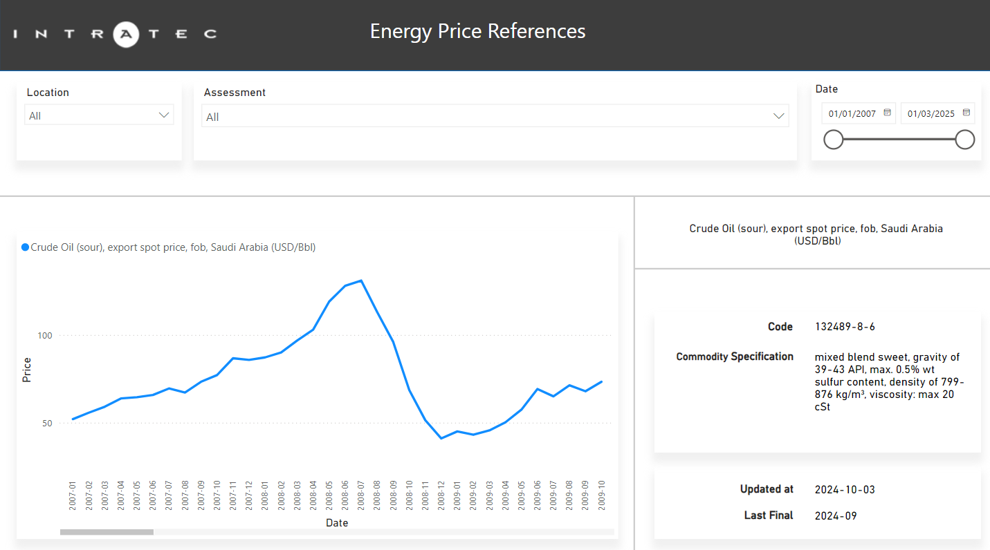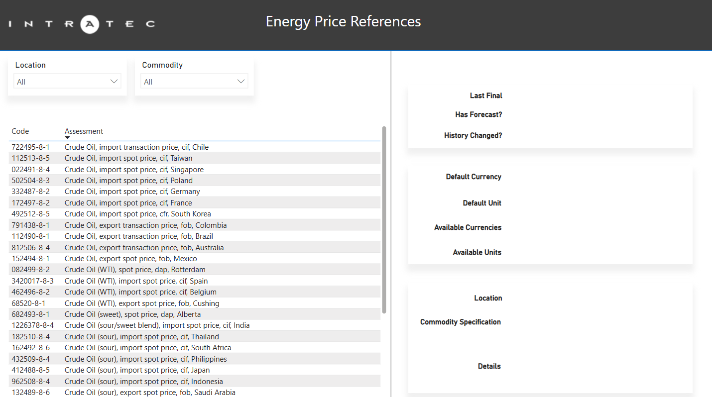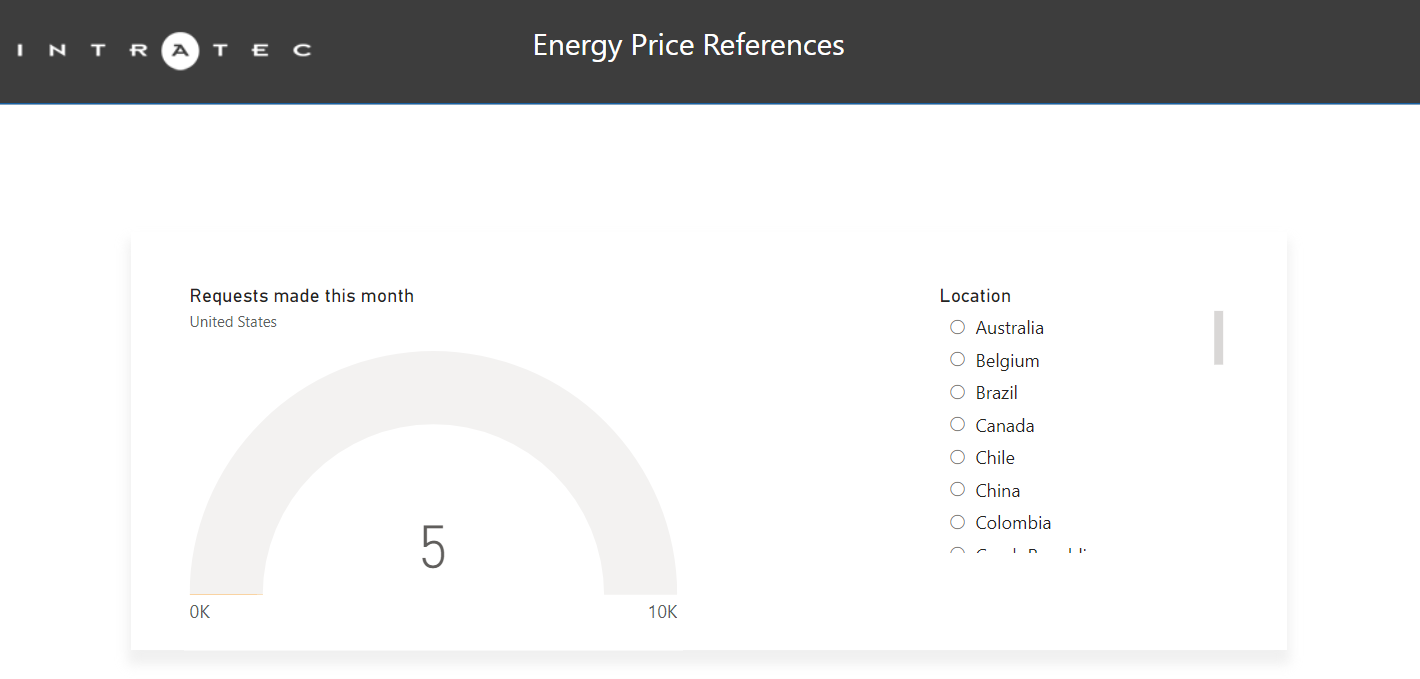 The Intratec Energy Price References Power BI Dashboard is a pre-configured, open-source project file (.pbix) that provides straightforward access to Intratec Energy Price References data. It can be used as a starting point for experienced users to develop more complex applications or as a ready-to-use simple dashboard for those in need of an easy way to access the data provided by Intratec.
