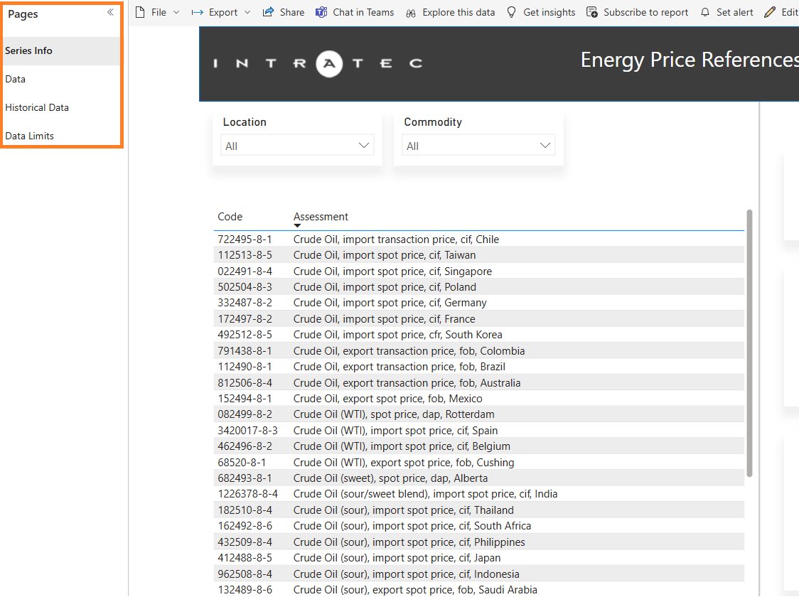 The Intratec Energy Price References Power BI Dashboard is divided into pages, which can be navigated through the left bar on Power BI online.