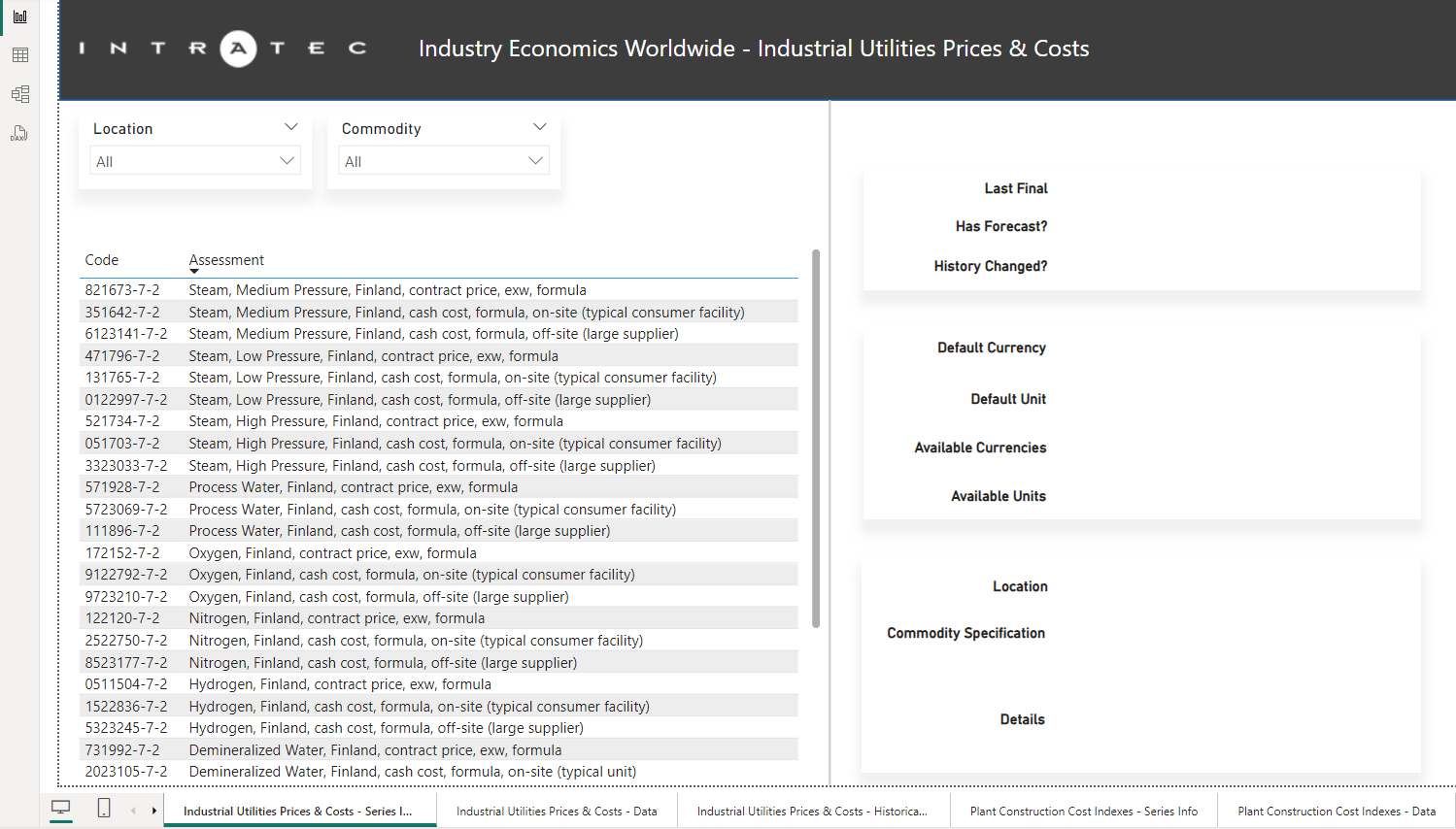By selecting an assessment on the Industrial Utilities Prices & Costs - Series Info page, the user may check the following details on the right side of the dashboard: