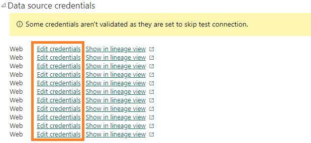 - Under Data source credentials, click on each of the Edit credentials buttons next to Web.