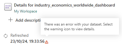 If there is anything wrong with the request, a warning symbol will appear next to the date and time of the last attempt to refresh the dataset: