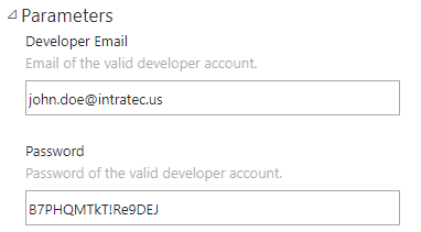 - Under Parameters, fill the credentials with a valid Developer account's Email and Password.