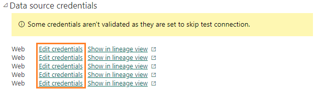 - Under Data source credentials, click on each of the Edit credentials buttons next to Web.